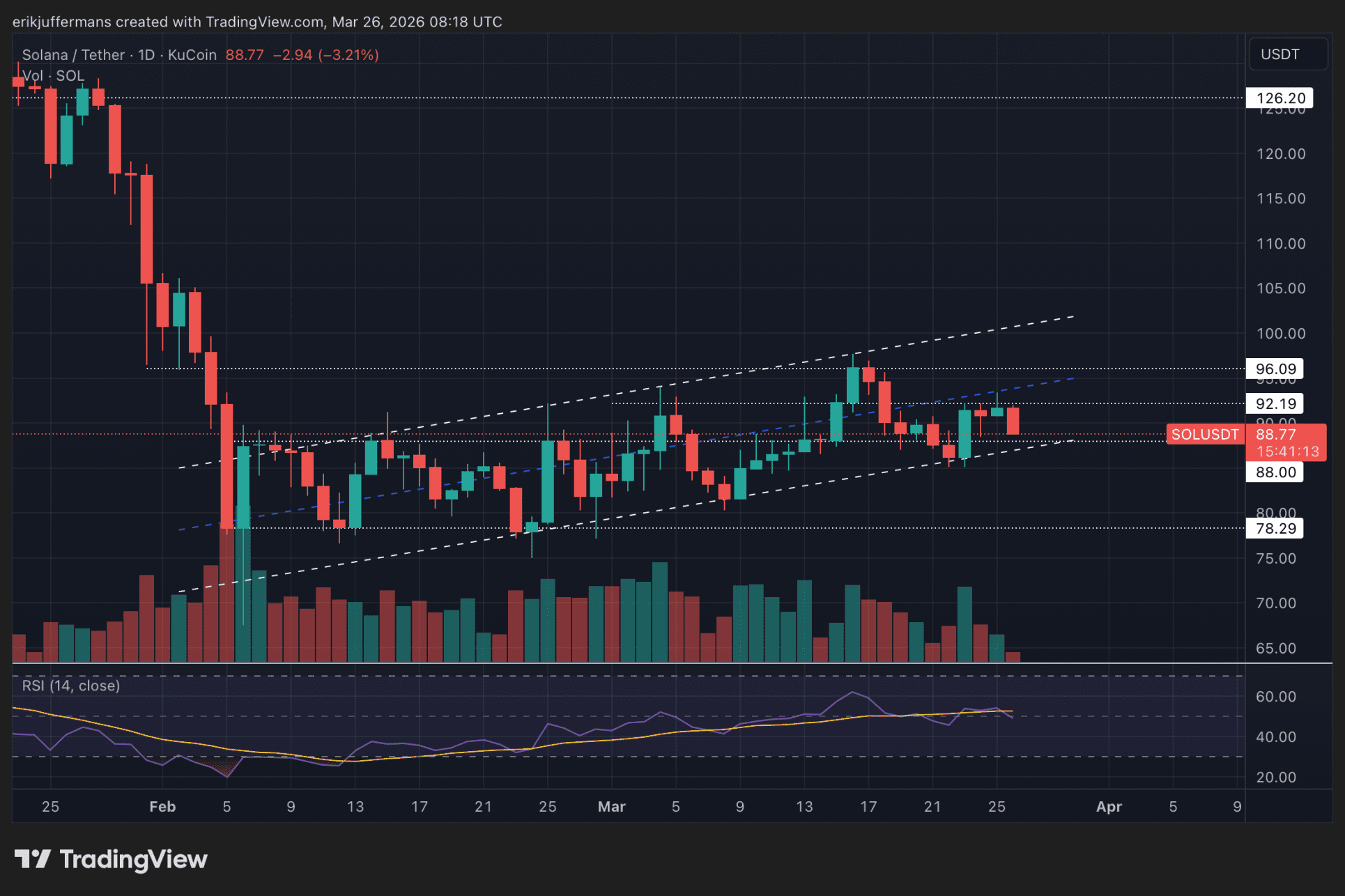 Bereits Anfang Februar verlor Solana die psychologische Grenze von 100 Dollar. Der Kurs fiel sogar kurzzeitig auf 70 Dollar und sucht seitdem nach bullishem Momentum. Ähnlich wie Bitcoin (BTC) und die meisten anderen Tokens befindet sich Solana in einem klaren Konsolidierungskanal, wie auf dem täglichen Chart unten zu sehen ist.