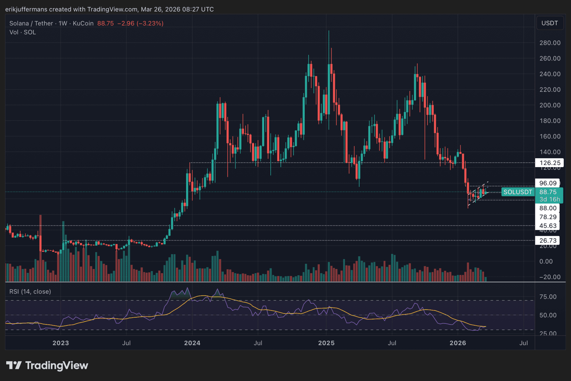 Der Wochenchart bietet etwas mehr Klarheit. Als SOL den Bereich um 125 Dollar verlor, fiel der Kurs rapide auf 70 Dollar. Sollte die aktuelle wöchentliche Unterstützung um 90 Dollar unterboten werden, gibt es kaum Widerstände bis zur 45-Dollar-Marke.