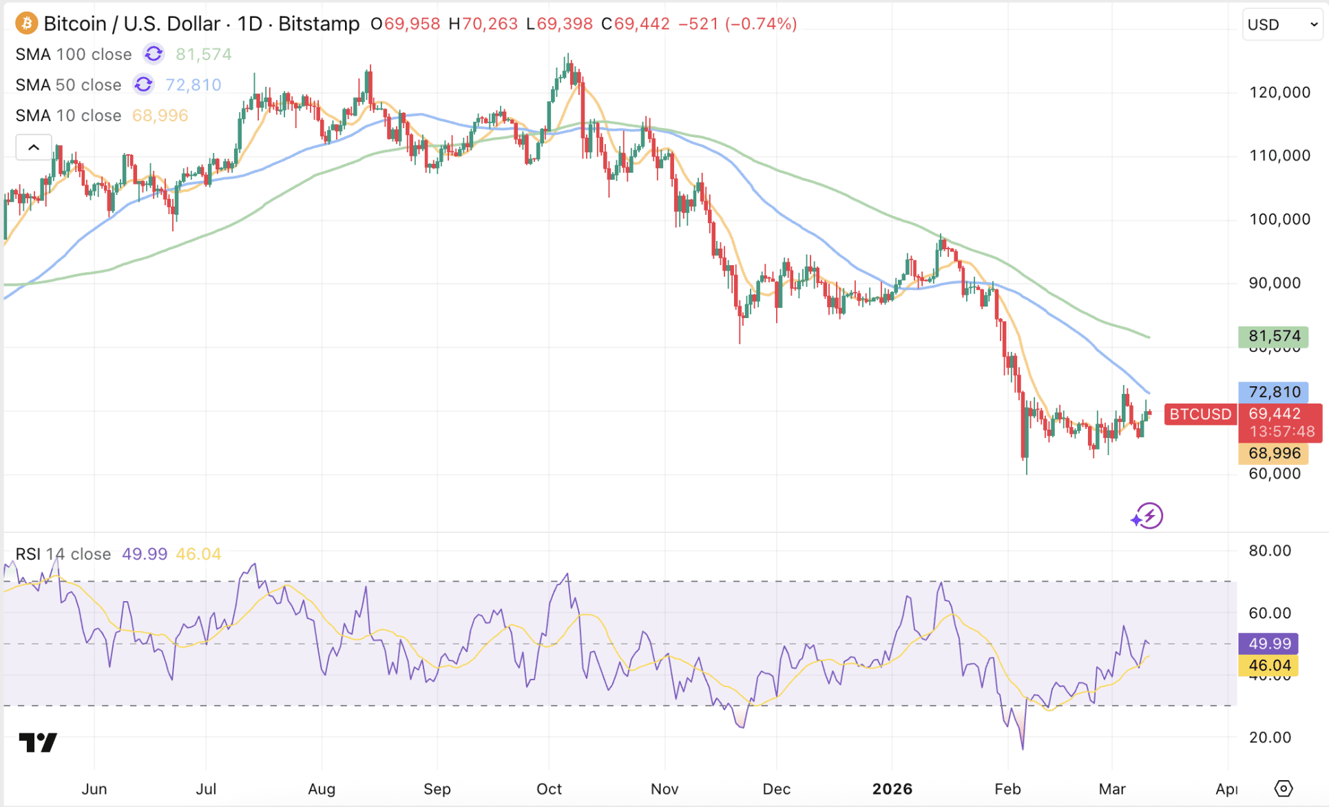 Gleichzeitig kämpft Bitcoin auch seine eigenen Kämpfe. Auf dem Tageschart wäre es beispielsweise ein positives Signal, wenn Bitcoin über 69.000 Dollar schließen würde. Dort finden wir derzeit den gleitenden 10-Tage-Durchschnitt des Kurses.