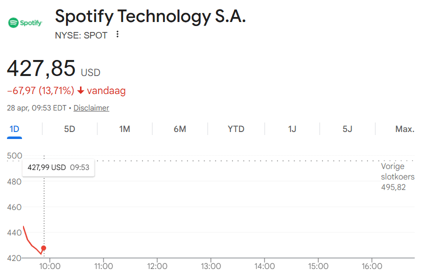 Die Aktie des Musikstreaming-Giganten Spotify ist stark gefallen. Innerhalb eines Tages verlor das Unternehmen 13 Prozent und der Kurs sank auf 427 Dollar.