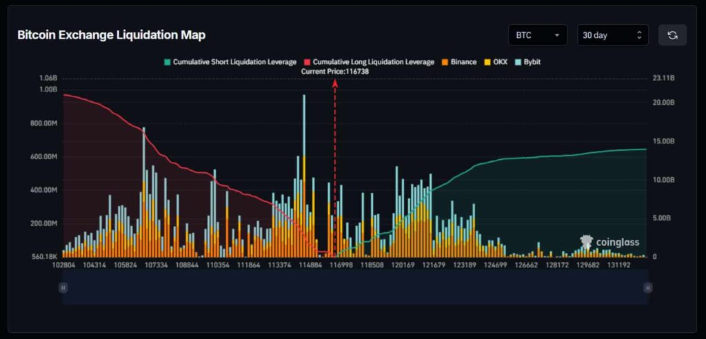 Der Bitcoin (BTC) Kurs steht erneut über 116.000 Dollar und nähert sich einer kritischen Grenze, die Short-Trader Kopfschmerzen bereitet. Laut CoinGlass sind derzeit fast 15 Milliarden Dollar an Short-Positionen auf Börsen wie Binance, Bybit und OKX offen. Ein Durchbruch über 120.000 Dollar könnte eine massive Short-Squeeze auslösen.