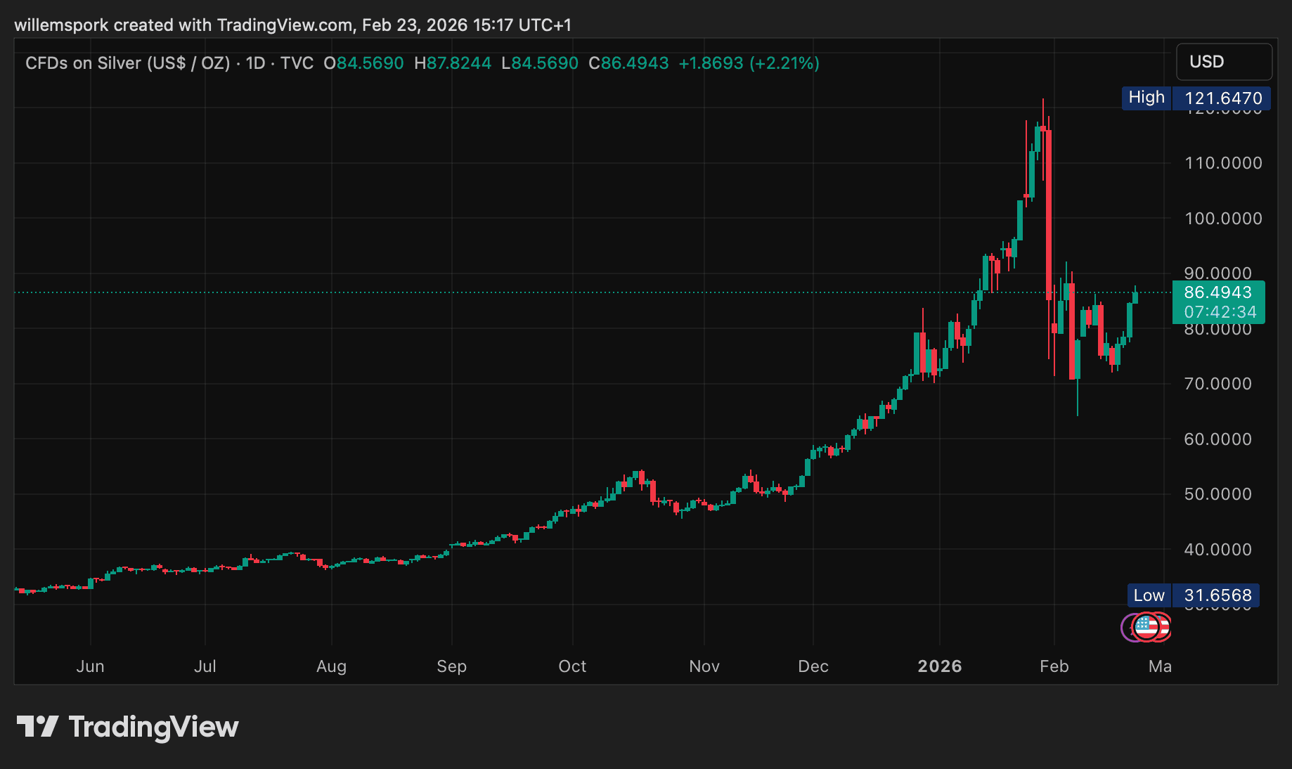 Silber war in den letzten Monaten extrem volatil. Am Montag lag der Preis bei rund 86 Dollar pro Unze. Das ist höher als gestern, aber deutlich niedriger als der Höchststand, der im Januar erreicht wurde. In dieses Bild passt auch Jelles Warnung: Ein Markt, der gerade von einem Hochpunkt kommt, kann noch wochen- oder monatelang unruhig bleiben.
