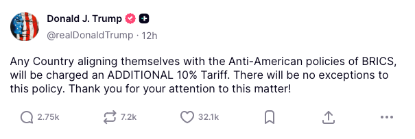 Donald Trump kündigte über soziale Medien an, dass Länder, die die Politik von BRICS unterstützen, mit einem zusätzlichen Importzoll von 10% rechnen können. Die Botschaft war kristallklar: „Es gibt keine Ausnahmen von dieser Regel.“