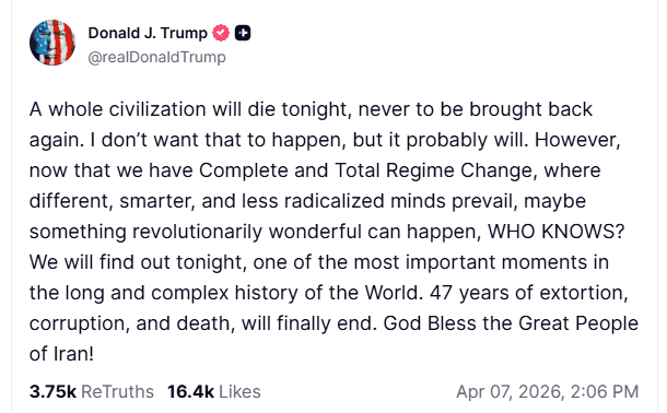 „Eine ganze Zivilisation wird heute Nacht sterben und nie wiederkehren. Ich will nicht, dass es passiert, aber es wird wahrscheinlich geschehen“, schrieb er in sozialen Medien.
