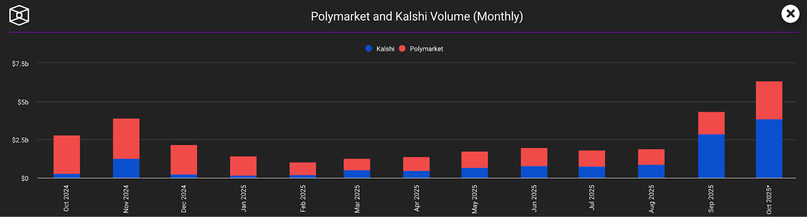 Kalshi ist eine weitere beliebte Prognoseplattform, die Monat für Monat weiter wächst. Laut Daten von The Block erreichten Polymarket und Kalshi im Oktober gemeinsam bereits ein Handelsvolumen von 6,33 Milliarden Dollar – obwohl der Monat noch nicht einmal vorbei ist.