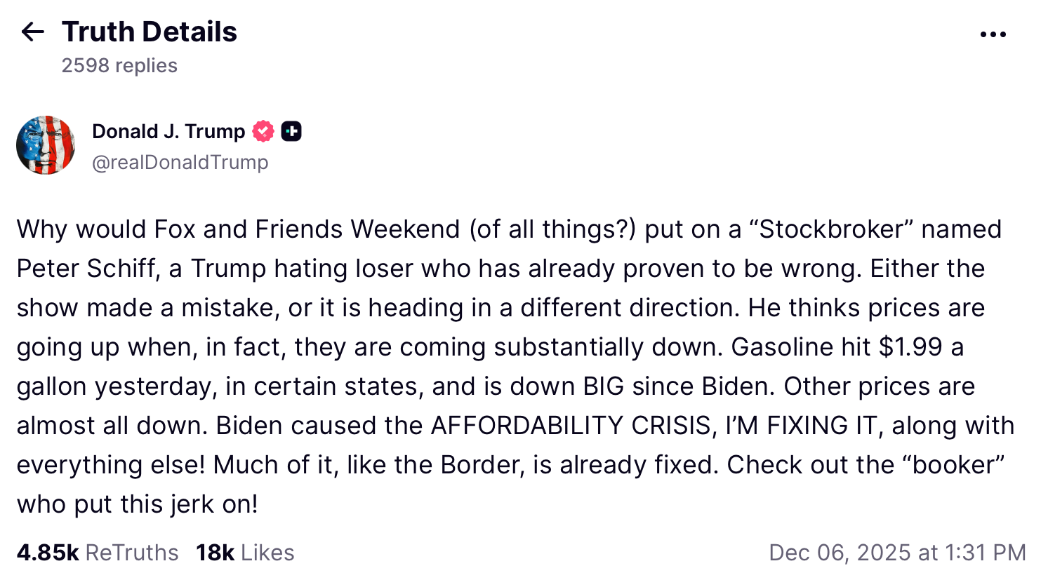 Peter Schiff begnügte sich nicht damit und forderte Trump oder einen Vertreter seiner Regierung zu einer Debatte über die amerikanische Wirtschaft heraus: „Da Präsident Trump mich einen Idioten und Verlierer nannte, weil ich behauptete, die Preise steigen weiter, während er darauf besteht, dass sie stark sinken, fordere ich ihn oder seinen ernannten Vertreter zu einer Debatte über die amerikanische Wirtschaft und die Effektivität seiner Politik heraus.“
