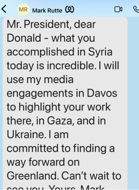 Wenige Stunden später teilte der Präsident einen Screenshot der Nachricht, die er persönlich vom ehemaligen niederländischen Ministerpräsidenten erhielt. „Ich bin entschlossen, eine Lösung für Grönland zu finden“, schrieb Rutte. „Ich freue mich darauf, dich zu sehen.“