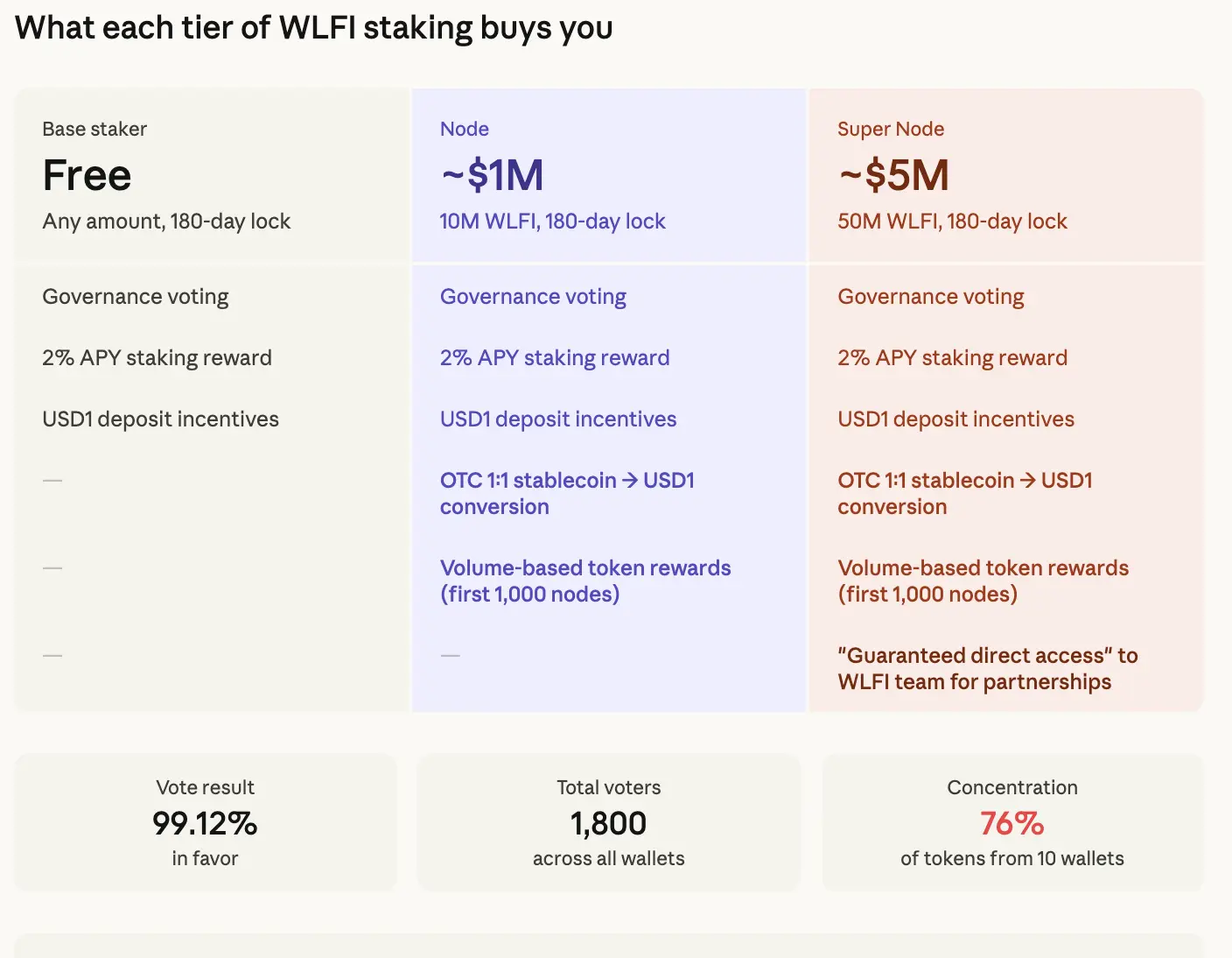 Die Abstimmung führt ein System mit drei verschiedenen Ebenen für das Staking des WLFI-Governance-Tokens ein. Wer Tokens hinterlegt, kann an der Governance des Protokolls teilnehmen und zusätzliche Vorteile erhalten.