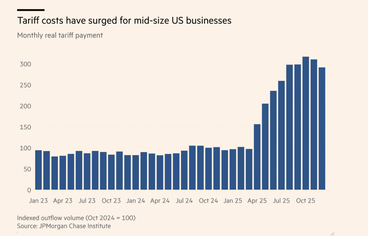 Laut Untersuchungen des JPMorgan Chase Institute haben sich die gezahlten Importzölle von sogenannten Mid-Market-Unternehmen innerhalb eines Jahres verdreifacht. Einige Firmen zahlten sogar mehr als dreimal so viel an Zöllen wie vor den Wahlen. Das unterstreicht, wie stark die Kosten des internationalen Handels gestiegen sind.