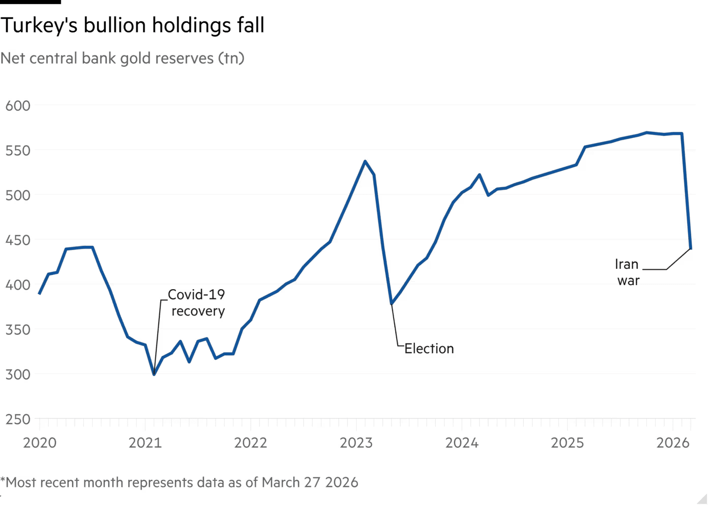 Laut der Financial Times verkaufte die türkische Zentralbank zwischen dem 27. Februar und dem 27. März etwa 52 Tonnen Gold. Zudem arrangierte die Bank etwa 79 Tonnen in Goldswaps. Bei solchen Swaps wird Gold faktisch verliehen, wodurch zusätzliches Angebot auf den Markt kommt und der Preis weiter unter Druck geraten kann.