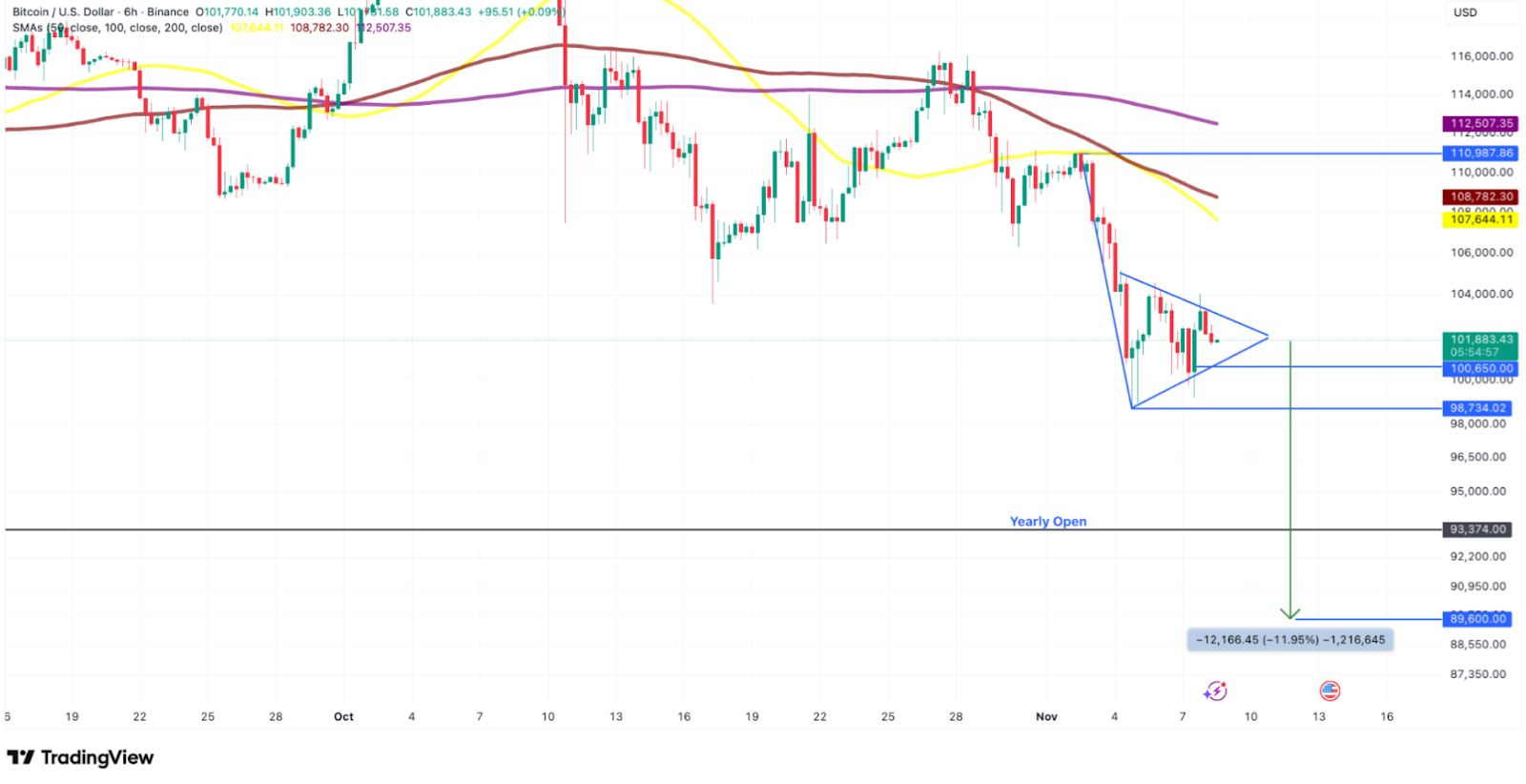 Unterdessen zeigt der Bitcoin-Chart ein sogenanntes „Bear-Pennant“-Muster. Dieses technische Muster entsteht nach einem scharfen Abverkauf und signalisiert eine mögliche Fortsetzung des Abwärtstrends. Ein Durchbruch unter die Unterstützungszone um 100.000 Dollar könnte den Kurs in Richtung 90.000 Dollar drücken.