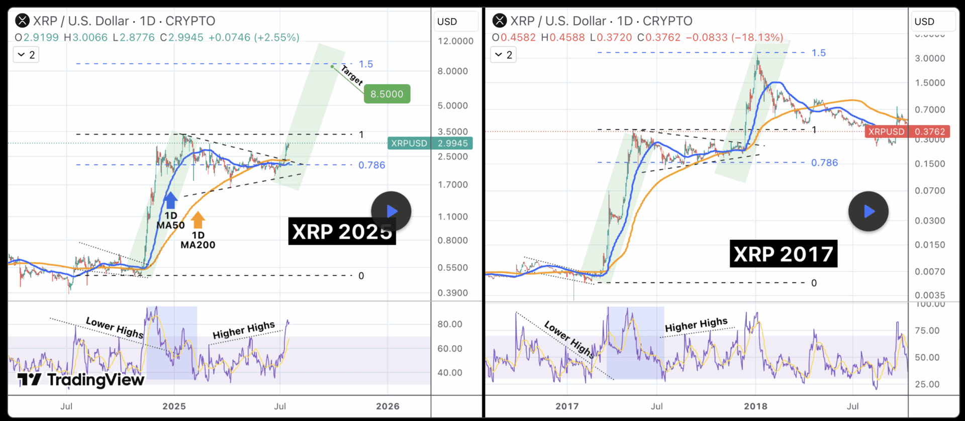 Auch dieses Jahr bewegte sich XRP monatelang innerhalb eines solchen Dreiecksmusters, bis der Kurs kürzlich mit Überzeugung nach oben ausbrach. Solche Ausbrüche gelten oft als Startpunkt für eine parabolische Rallye. TradingShot weist zudem auf ein nahendes ‘golden cross’ hin, bei dem das 50-Tage gleitende Durchschnitt das 200-Tage gleitende Durchschnitt kreuzt. Das wird traditionell als ein starkes bullishes Signal angesehen.