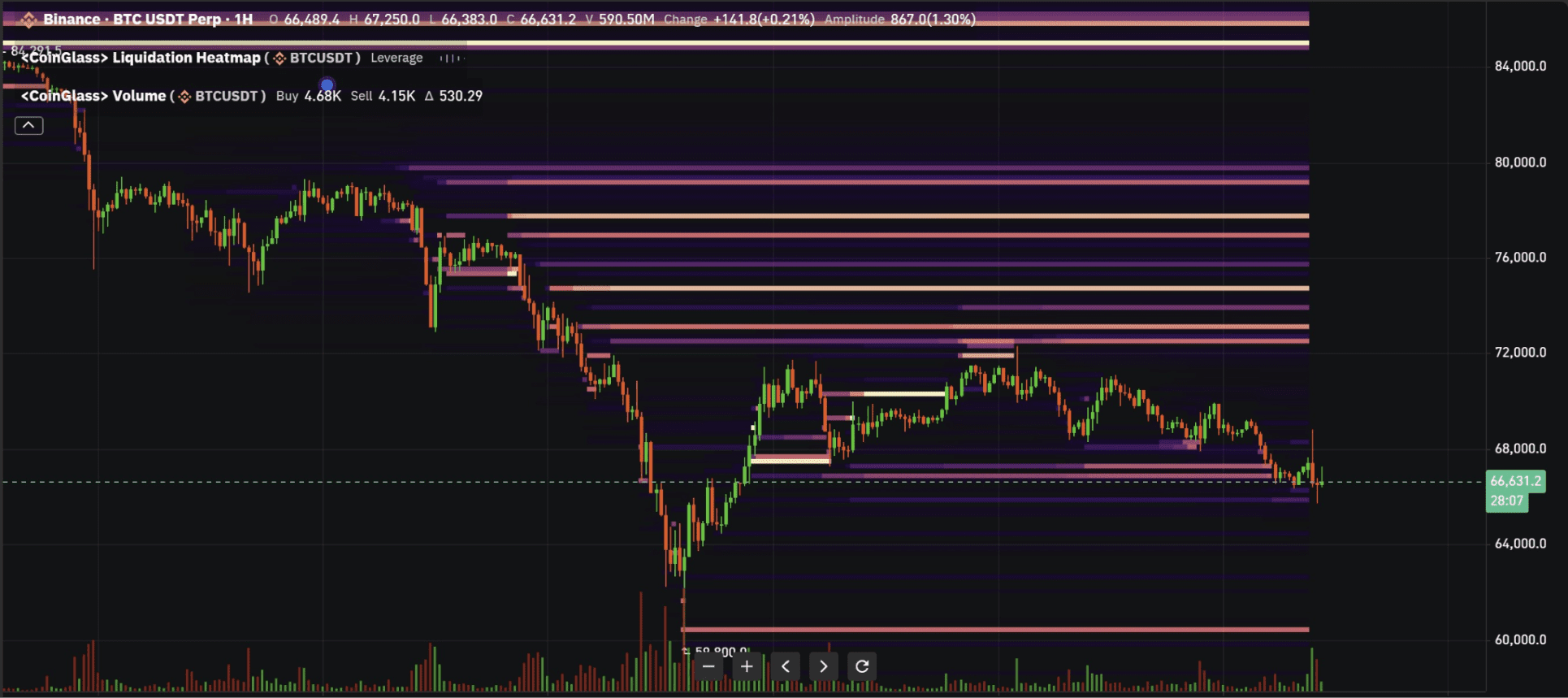 Liquiditätsdaten untermauern dieses Bild. Heatmaps zeigen, dass oberhalb von 72.000 Dollar zwar viele Orders liegen, aber zwischen 66.000 und 60.500 Dollar eine Zone mit geringer Liquidität existiert. Da hier wenige Kauf- und Verkaufsorders platziert sind, kann der Kurs schneller nach unten rutschen.