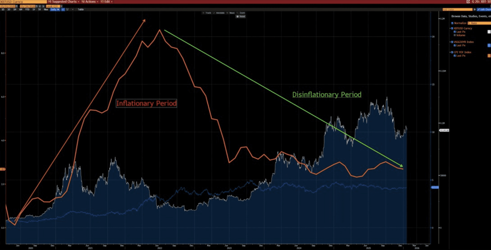Daten seit 2020 zeigen, dass BTC typischerweise während inflationsgetriebener Phasen fällt und während der Desinflation steigt. Diese negative Korrelation zwischen BTC und Inflation wird durch das aktuelle Klima verstärkt.