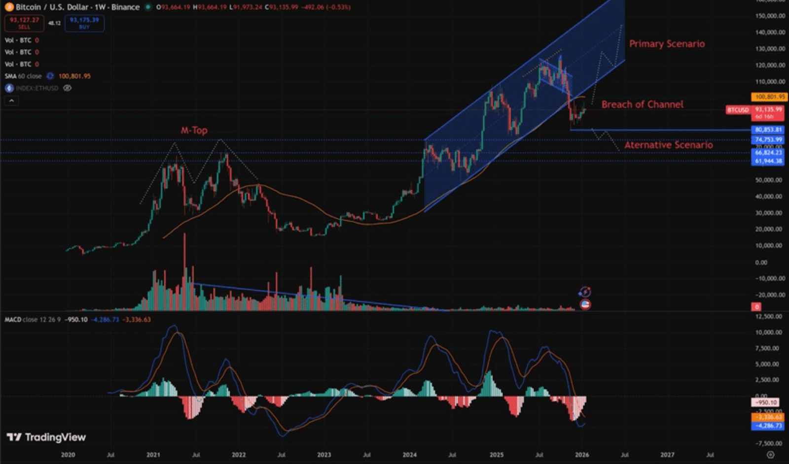 Die technische Marktstruktur von Bitcoin im Jahr 2022 war durch eine klassische M-Top-Formation auf dem Wochenchart gekennzeichnet, ein Muster, das oft zu langanhaltenden Abwärtstrends führt.