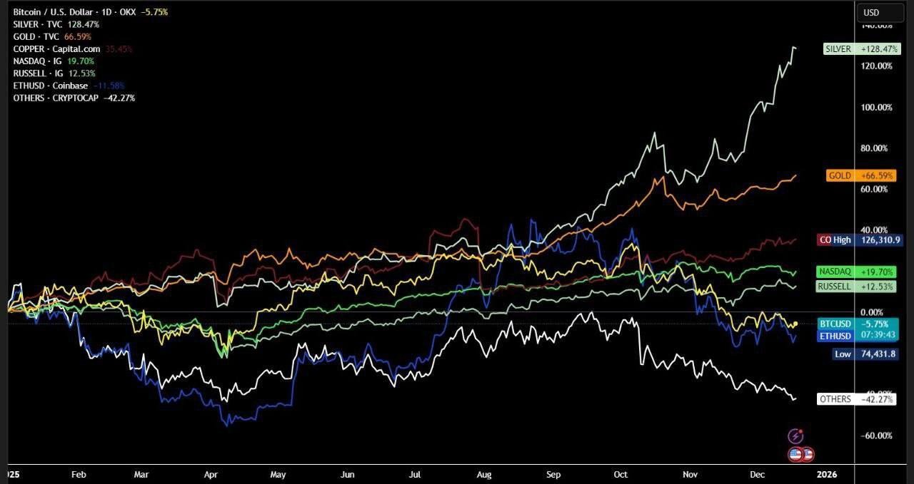 Anleger verfügen nicht über unbegrenzte Mittel. Wenn Gold stark performt, zieht es Kapital an, das sonst in Aktien oder Krypto hätte fließen können. Im Jahr 2025 ist dieser Unterschied auffällig groß. Silber verzeichnet einen Gewinn von über hundert Prozent, Gold mehr als sechzig Prozent, während Bitcoin leicht negativ notiert und Altcoins erhebliche Verluste aufweisen.
