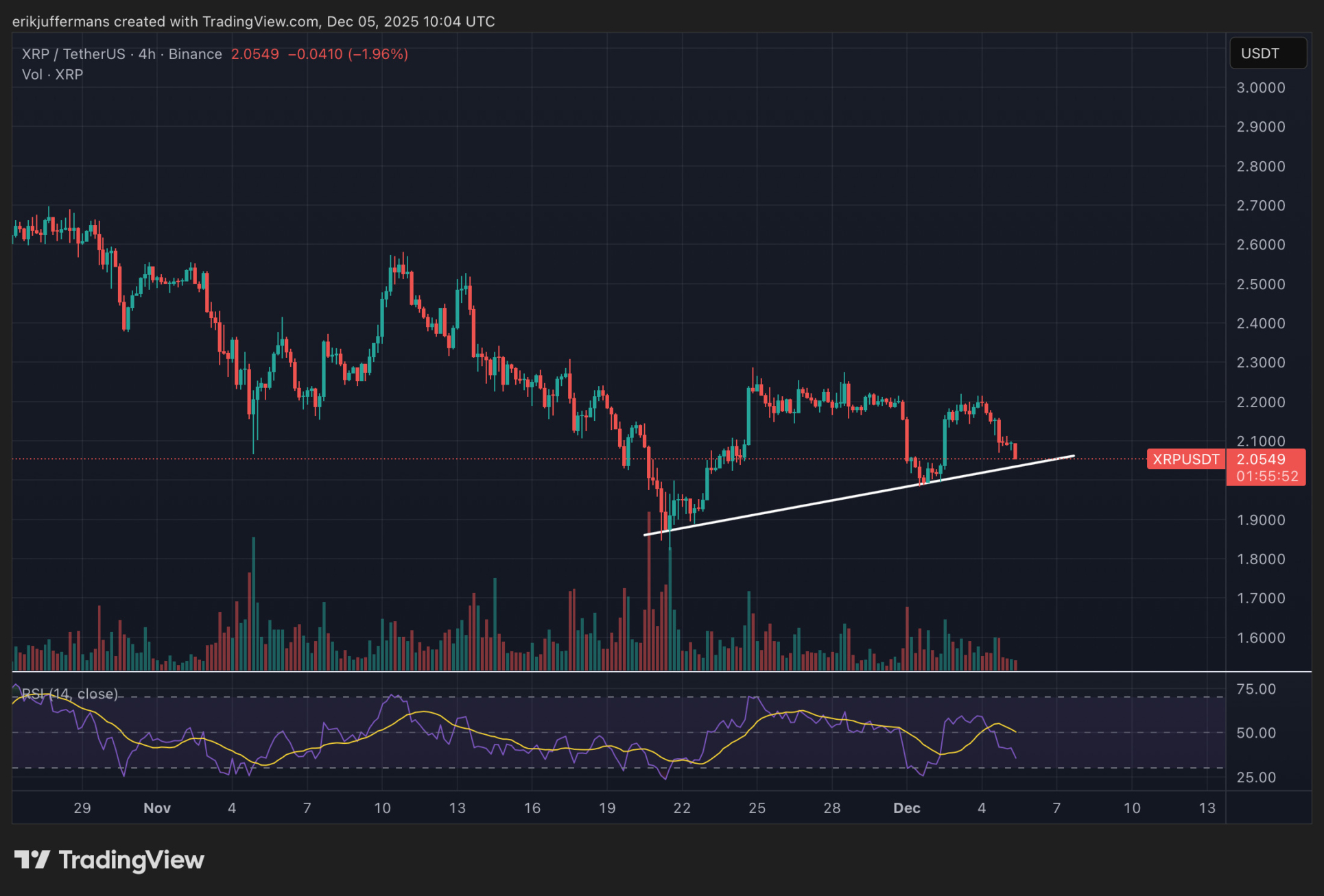 Ripple (XRP) hat es etwas schwerer. Während des jüngsten Anstiegs auf 2,20 Dollar verzeichnete XRP kein höheres Hoch und bleibt daher weiterhin in einem Abwärtstrend. Dennoch notierte die Münze am Montag, mit einem Tief von 1,99 Dollar, ein höheres Tief. Dies ist ein entscheidendes Niveau, das XRP halten muss. Derzeit handelt XRP bei etwa 2,06 Dollar, was einem Rückgang von über 5 Prozent entspricht.