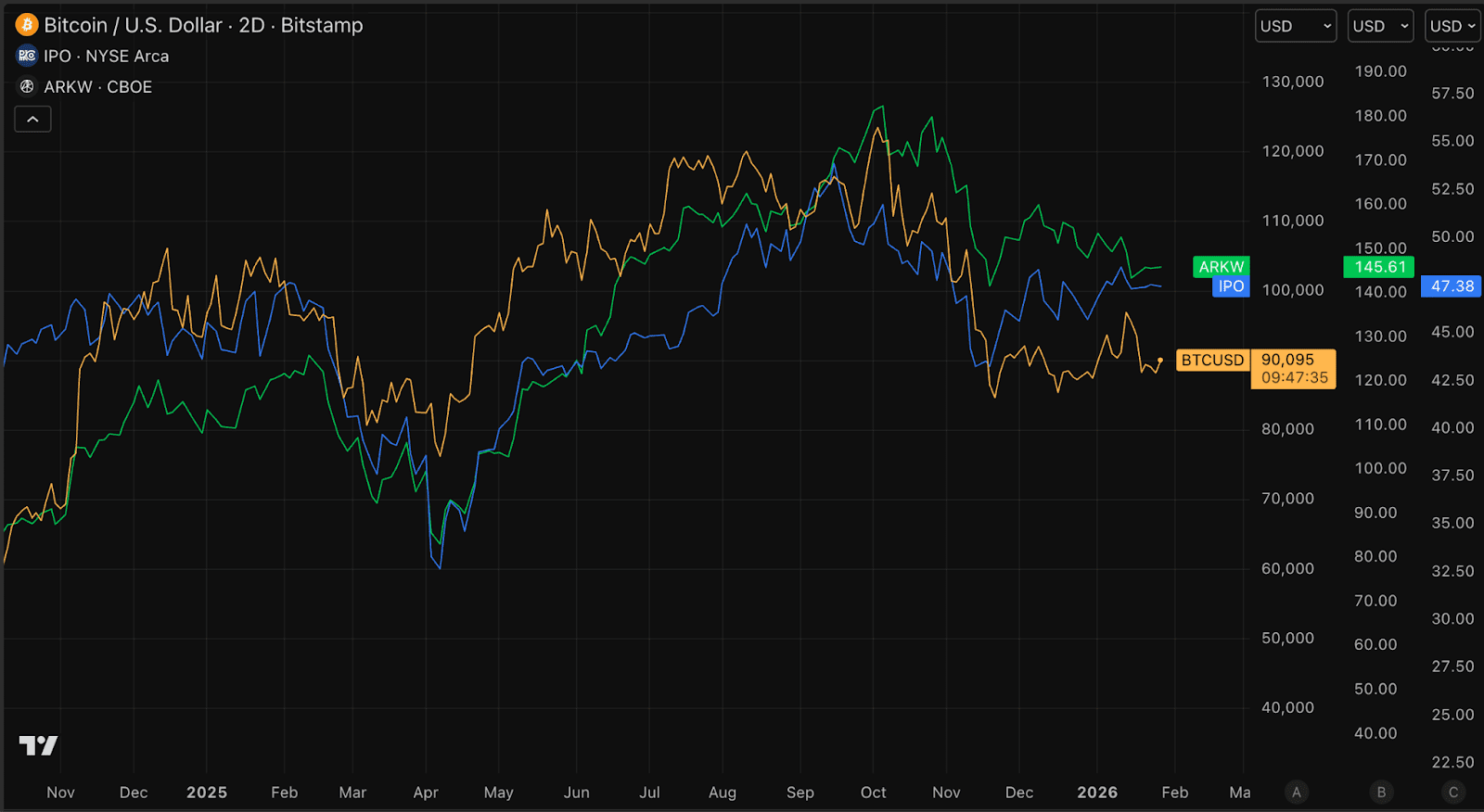 Schauen Sie beispielsweise auf ETFs, die Zugang zu jungen Börsengängen (IPOs) bieten, oder auf Fonds, die sich auf innovative Technologieunternehmen (ARKW) konzentrieren. Diese Anlagen florieren in einem ausgesprochen riskanten Umfeld, in dem Wachstum wichtiger ist als Sicherheit. Genau hier lag auch Bitcoins Stärke.