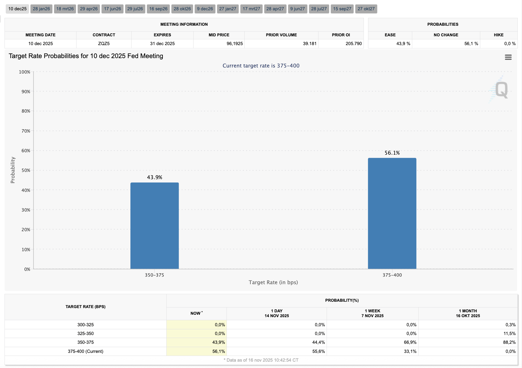 Noch vor Kurzem lag die Wahrscheinlichkeit für eine Zinssenkung der US-Notenbank am 10. Dezember praktisch bei 100 Prozent. Inzwischen steht die Chance für dieses Szenario nur noch bei 43,9 Prozent.