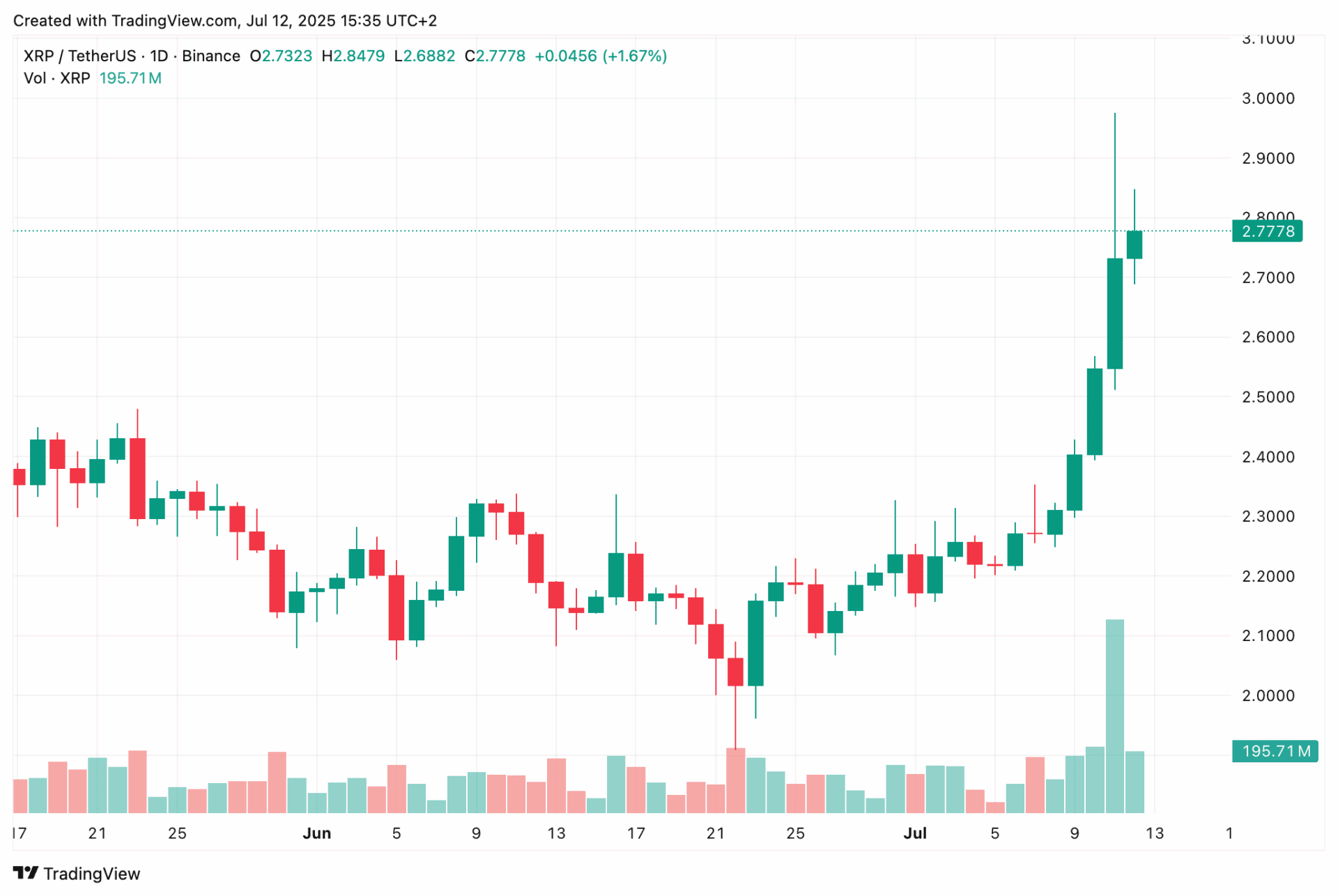 Freitag stand der Kryptomarkt in Flammen. Bitcoin (BTC) brach auf ein Allzeithoch von 118.800 Dollar durch, und XRP profitierte maximal. Der Kurs von XRP schoss um 20 Prozent nach oben, wodurch die Münze nun die drittgrößte Kryptowährung der Welt ist. Was steckt hinter diesem plötzlichen Ausbruch? Und kann der XRP-Kurs noch weiter steigen?