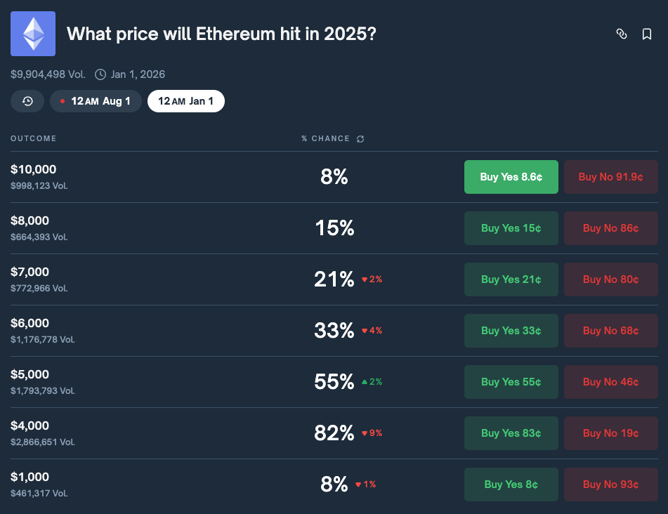 Die Schätzungen auf Polymarket ändern sich ständig. So warfen wir vor zehn Tagen auch schon einen Blick auf die Kursprognosen, und damals waren die Aussichten viel pessimistischer. Damals schätzten nur 28 Prozent der Investoren die Chance realistisch ein, dass ETH 5.000 Dollar erreichen würde. Diese Schätzungen sollten daher mit Vorsicht genossen werden. Sie sind nämlich vor allem eine Reflexion des Zeitgeistes.