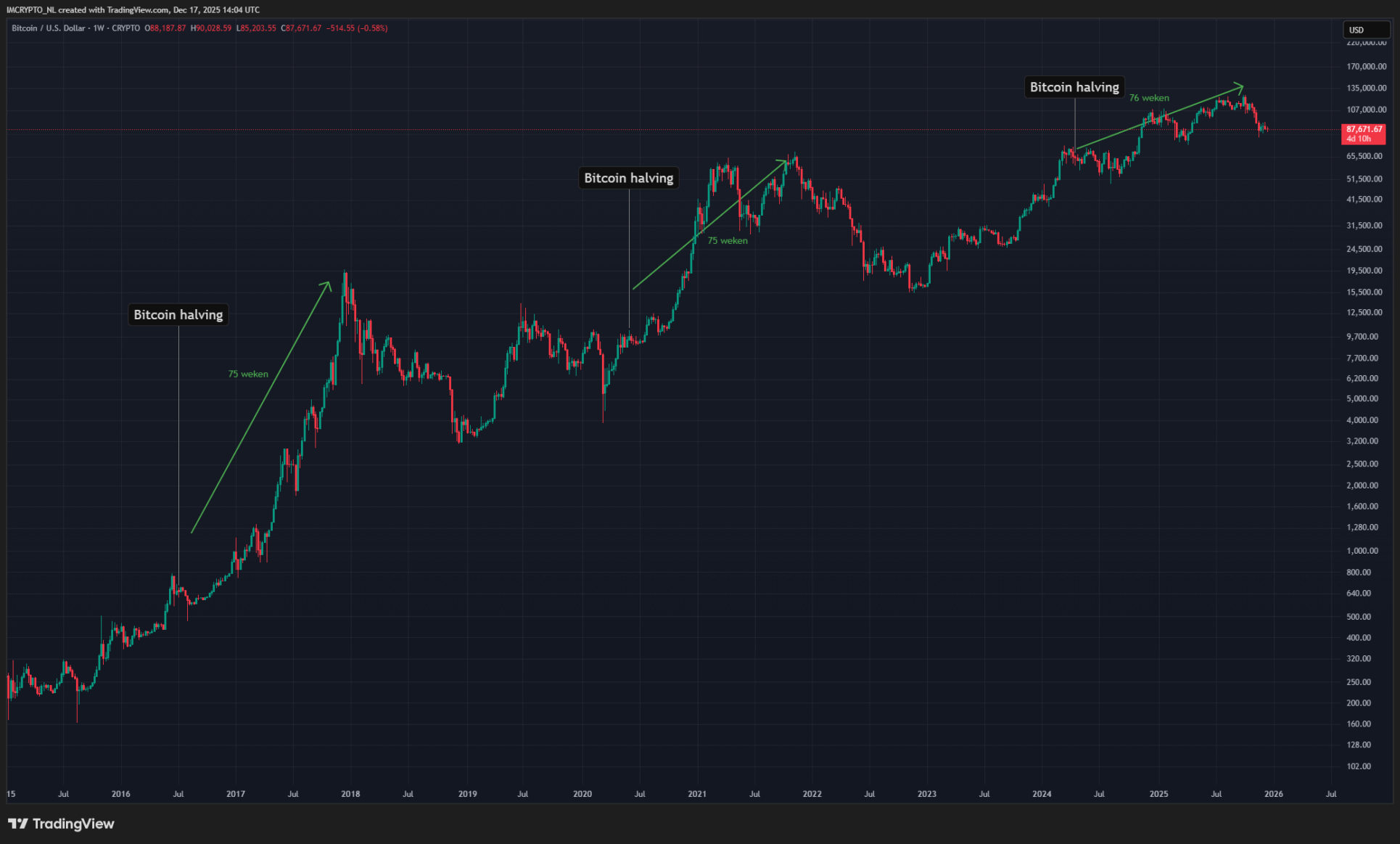 Bemerkenswerterweise erreichten die letzten beiden Bullenmärkte etwa 75 Wochen nach dem Halving ihren Höhepunkt. Dieses Mal wurde der aktuelle Rekord nach 76 Wochen erreicht. Kein Wunder, dass viele Anleger glauben, dies sei der Höhepunkt gewesen.