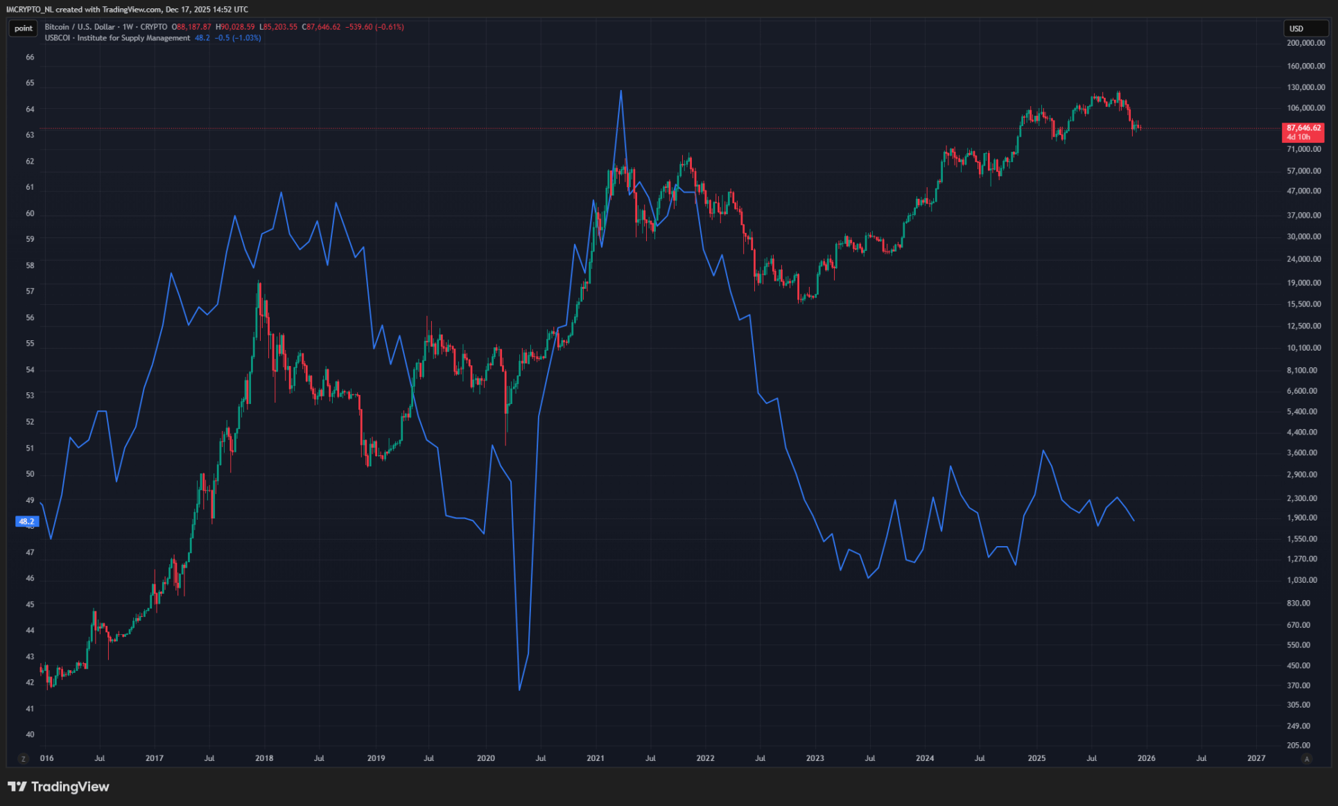 In den letzten drei Jahren hat Bitcoin zwar einen Aufwärtstrend erlebt, aber ein bedeutungsvoller PMI-Ausbruch steht noch aus. Gerade die Phase der wirtschaftlichen Expansion fiel in der Vergangenheit immer mit den stärksten Preisanstiegen der Kryptowährung zusammen.