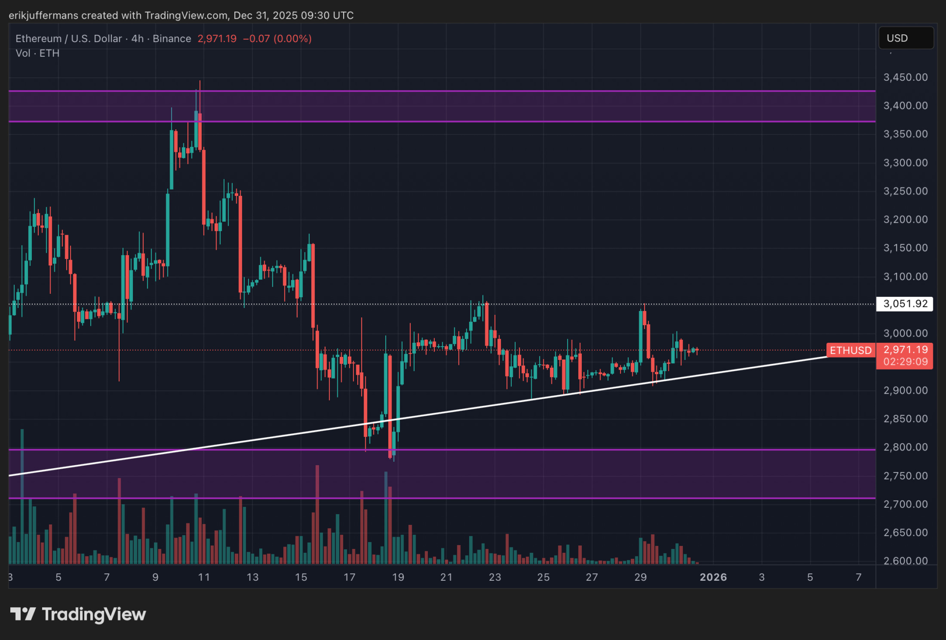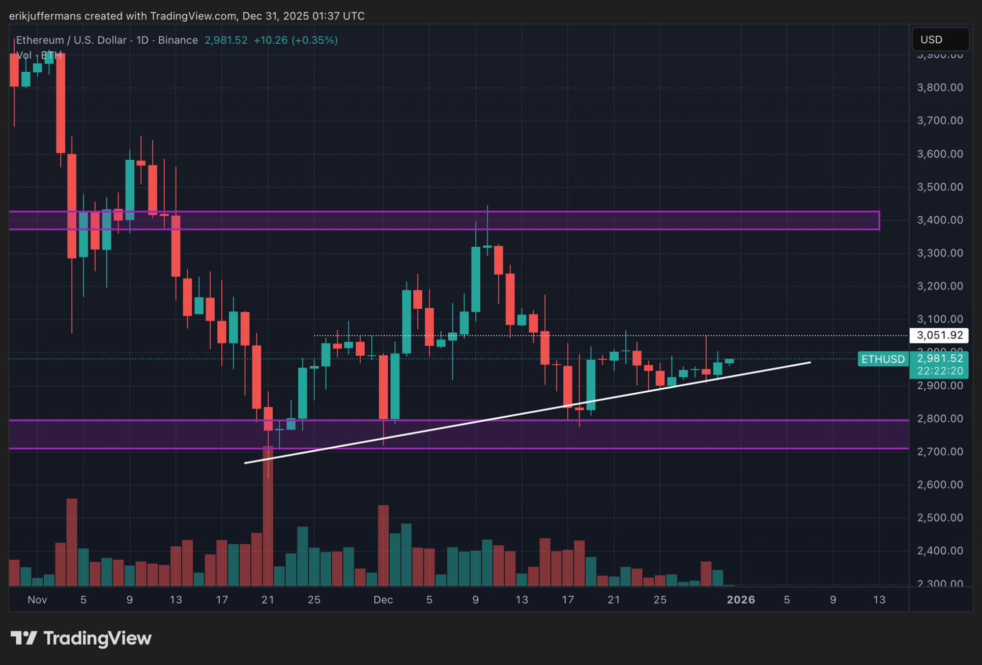 Gestern haben wir in unserer Bitcoin (BTC) Analyse festgestellt, dass die Volatilität auf dem Kryptomarkt weitgehend fehlt. Dies gilt auch für Ethereum (ETH). Der Kurs bewegt sich seit zehn Tagen in einer engen Spanne zwischen etwa 2.900 und 3.000 Dollar. Mit dem neuen Jahr in Sicht ist es ein guter Zeitpunkt, eine Bilanz für ETH zu ziehen.