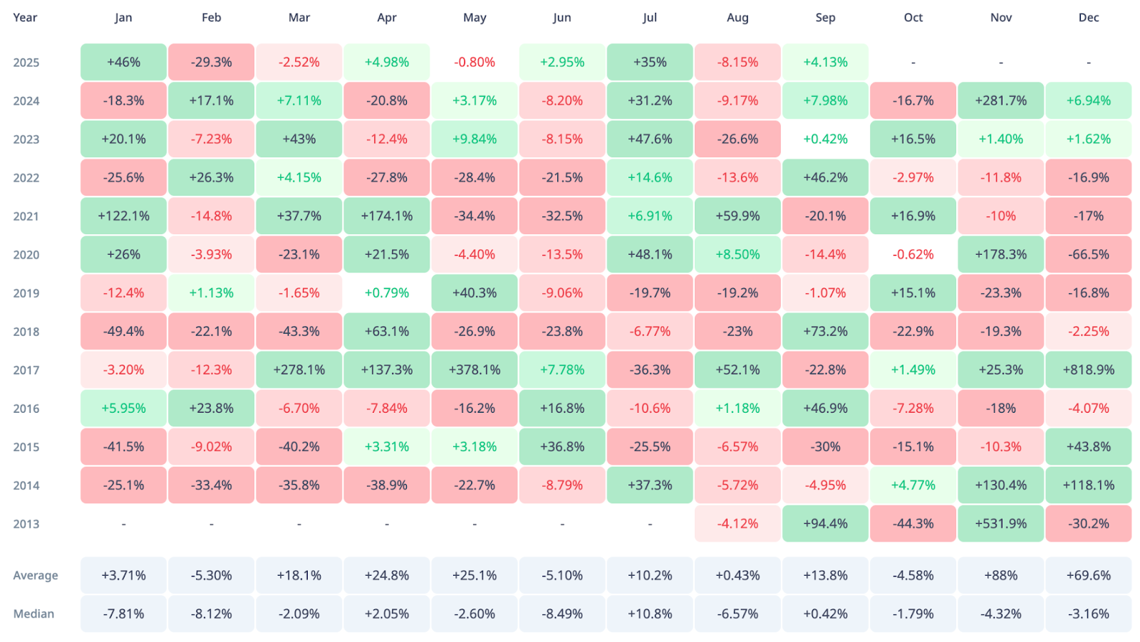 Positiv ist, dass die Monate nach dem Oktober historisch gesehen zu den profitabelsten gehören. November und Dezember sind traditionell starke Monate für XRP, mit Spitzenwerten von bis zu 531,9 und 818,9 Prozent. Im Durchschnitt erzielen sie einen Anstieg von 88 Prozent im November und 69,6 Prozent im Dezember.