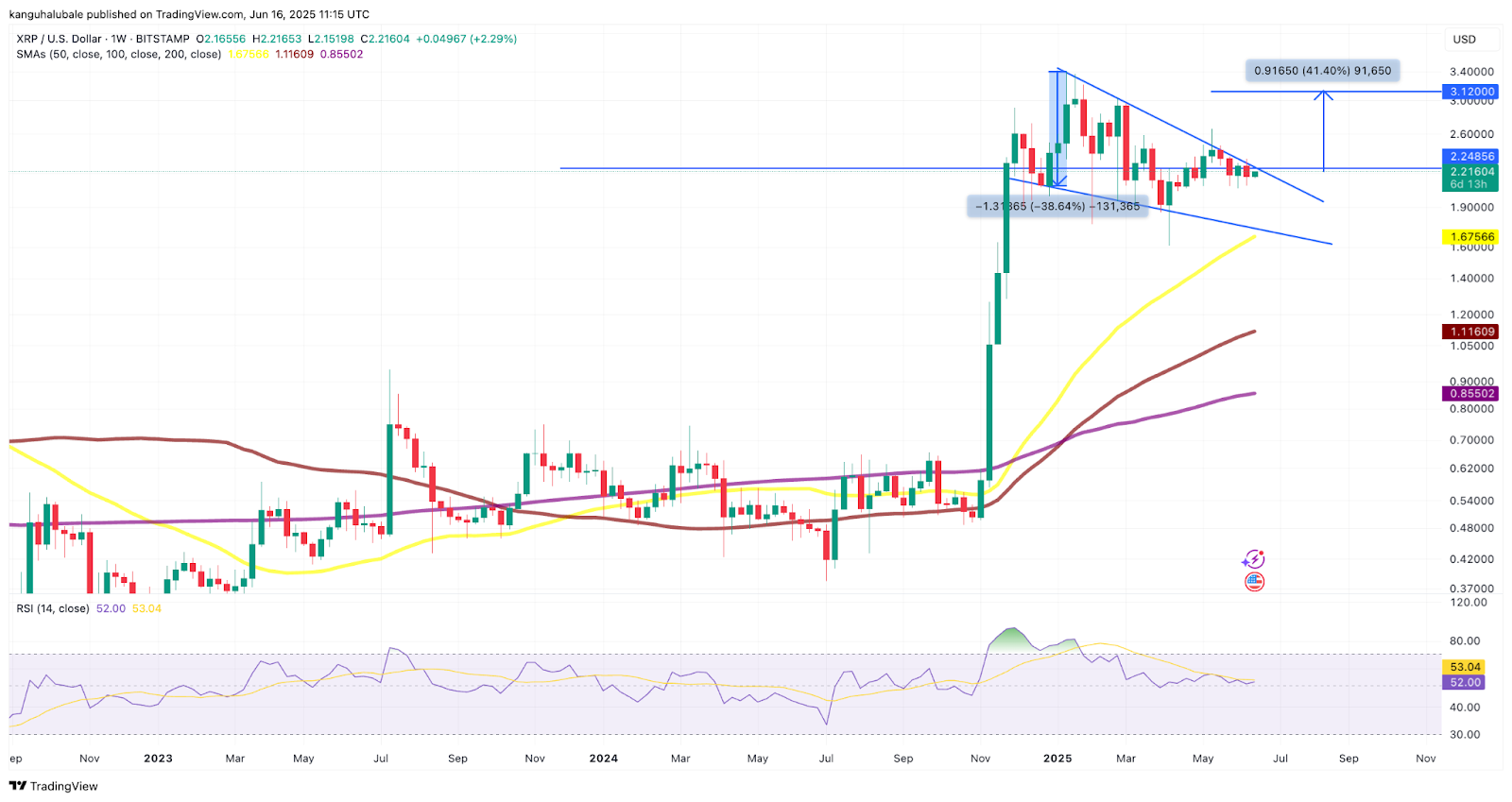 Auch aus technischer Sicht gibt es positive Signale für XRP-Investoren. Analysten weisen auf ein falling wedge Muster auf dem Wochenchart hin, ein klassisches Muster, das oft einer Aufwärtsbewegung des Kurses vorausgeht.