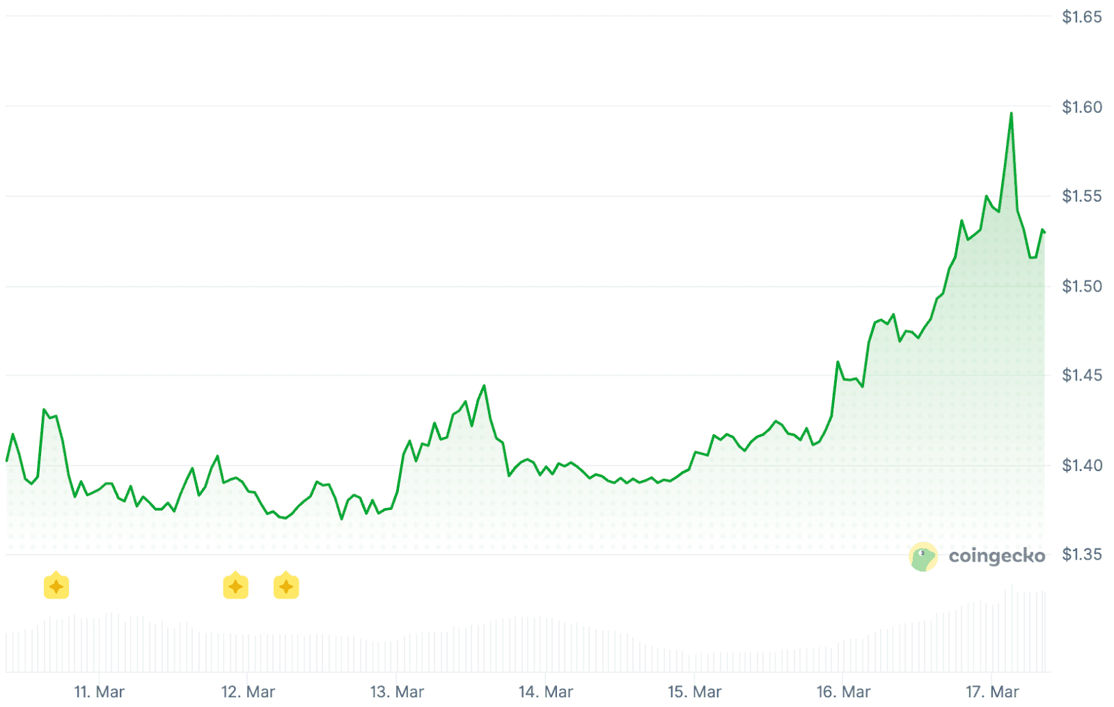 In den letzten sieben Tagen ist die digitale Währung bereits um 10,8 Prozent gestiegen und notiert jetzt bei 1,53 Dollar. Heute Morgen erreichte XRP sogar kurzzeitig einen Preis von fast 1,61 Dollar, das höchste Niveau seit etwa einem Monat.