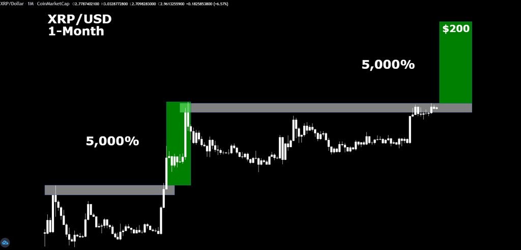 CryptoBull geht noch einen Schritt weiter. Er weist auf die Vergangenheit hin, in der XRP um über 5.000 Prozent stieg nach einem ähnlichen Ausbruch. Wenn sich dieses Muster wiederholt, liegt ein Kurs von 200 Dollar in Aussicht.