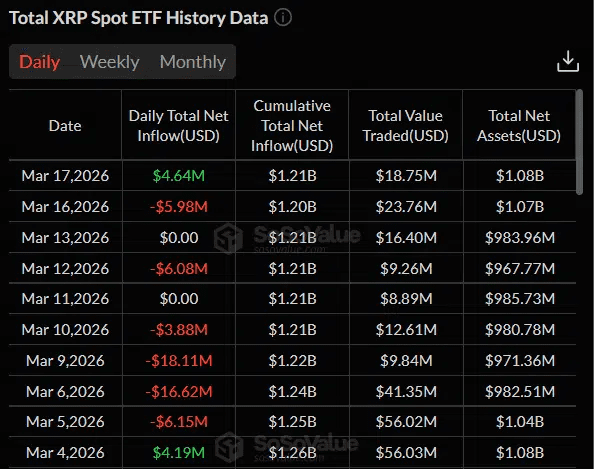 Daten der Analyseplattform Sosovalue belegen, dass XRP-ETFs am 17. März zusammen 4,64 Millionen Dollar an neuen Zuflüssen verzeichneten. Es ist der erste Tag mit positiven Zahlen seit dem 4. März.