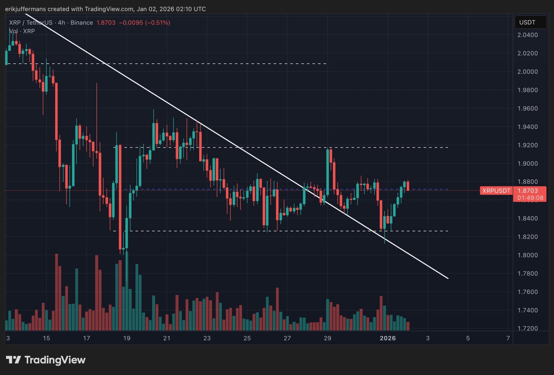 Wenn wir auf den Vier-Stunden-Chart zoomen, sehen wir, dass XRP nun in einem engen Kanal zwischen etwa 1,82 und 1,92 Dollar handelt. Der Kurs bewegt sich derzeit genau zwischen diesen beiden Niveaus.