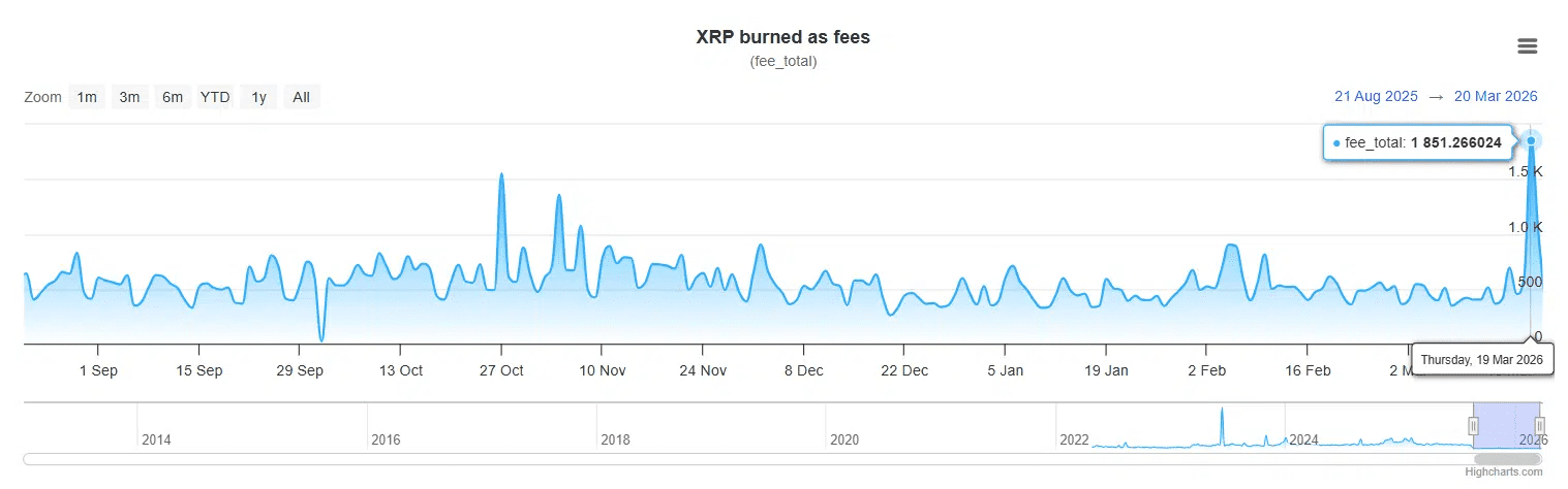 Ein Anzeichen ist das Gebührenmechanismus des Netzwerks. Hierbei spielt die Burn-Rate eine wichtige Rolle, also die Menge an XRP, die als Transaktionsgebühren dauerhaft vernichtet wird. Diese steigt normalerweise, wenn das Netzwerk stärker genutzt wird. Am 19. März wurden 1851 XRP verbrannt, 270 Prozent mehr als der Durchschnitt von 500 pro Tag seit August 2025. Das deutet auf ein starkes Aktivitätswachstum hin.