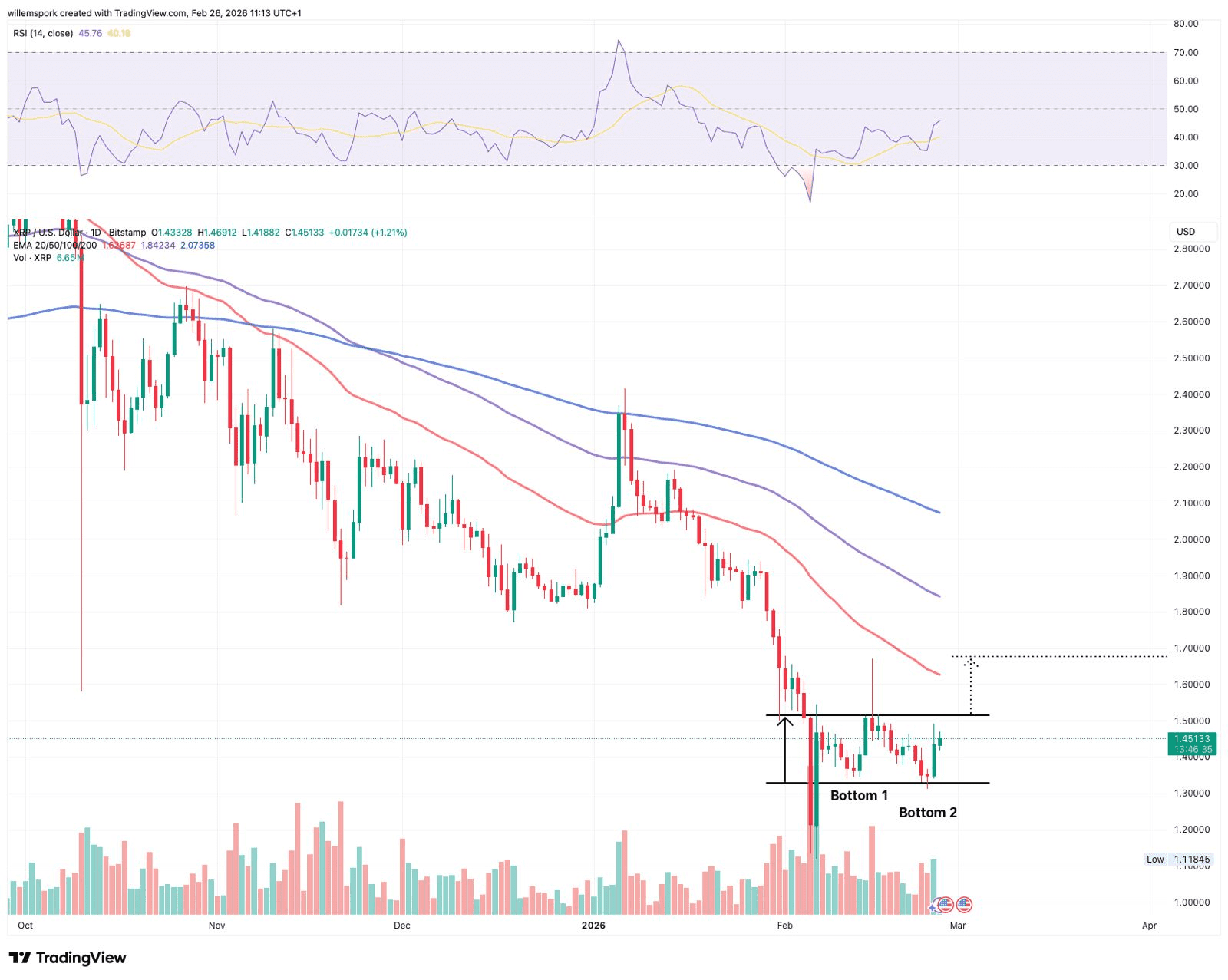 Auf dem Tageschart scheint XRP einen doppelten Boden bei 1,30 bis 1,35 Dollar zu bilden. Dieses Niveau hielt im Februar zweimal stand. Ein doppelter Boden entsteht, wenn der Kurs zweimal das gleiche Unterstützungsniveau testet und dann wieder ansteigt. Durchbricht der Kurs anschließend die Nackenlinie, gilt dies oft als Bestätigung für eine Trendumkehr.