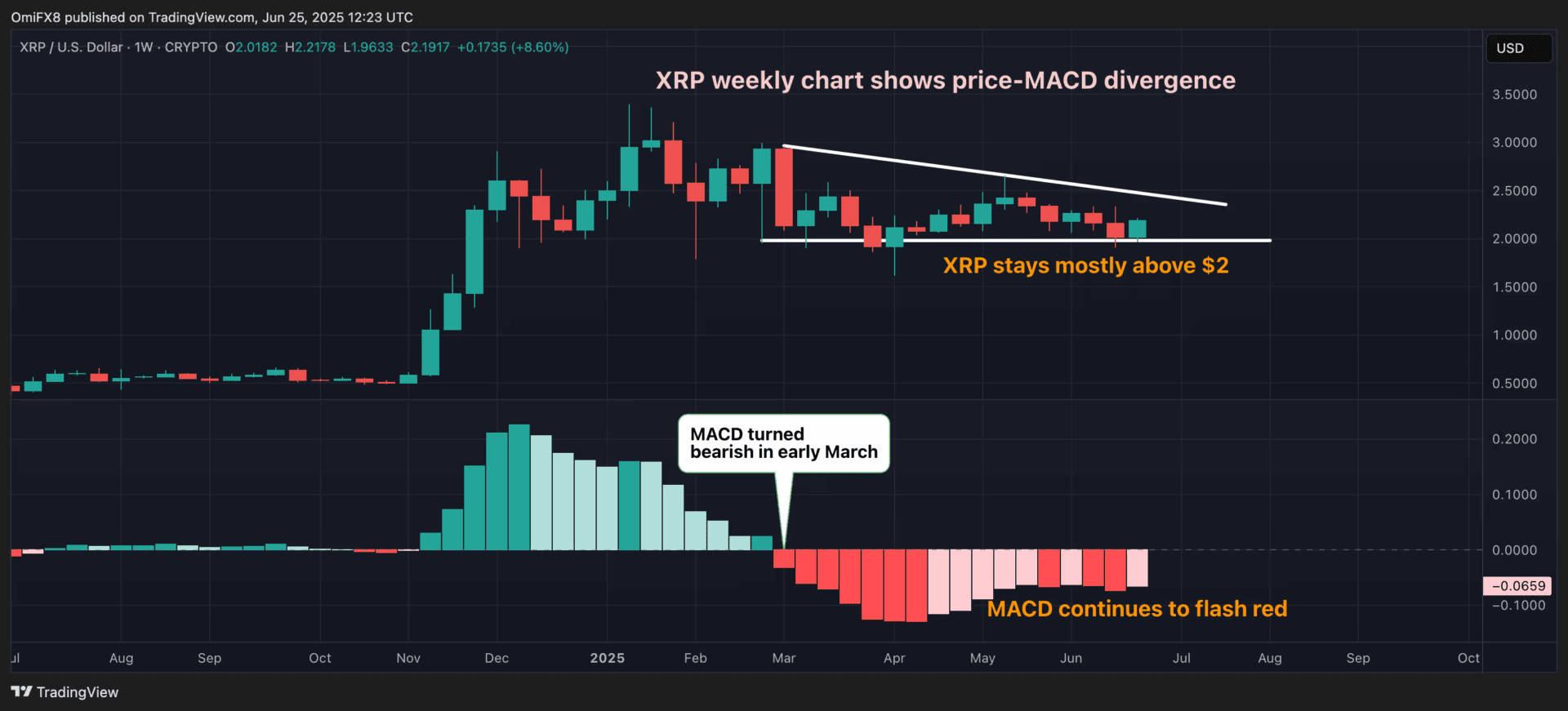 Nun sieht er dasselbe bei XRP geschehen. Auch dort ist der MACD seit März rot – ein Zeichen von Schwäche. Aber der Kurs weigert sich zu fallen und bleibt hartnäckig über 2 Dollar. Diese Diskrepanz zwischen Indikator und Kurs nennen Analysten eine Divergenz. Und das könnte, wie bei Bitcoin, durchaus der Auftakt für einen kräftigen Anstieg sein.