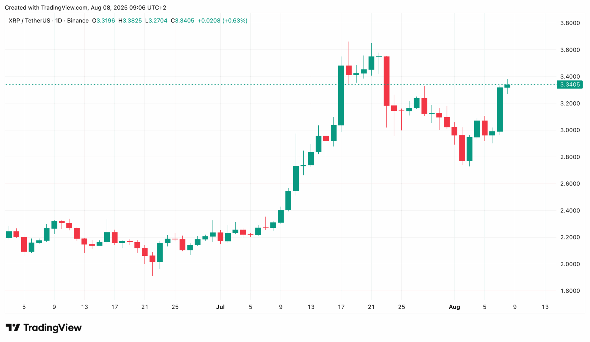 Der XRP-Kurs stieg in den letzten 24 Stunden um zwölf Prozent, von 2,99 auf 3,35 Dollar. Dieser Kurssprung kommt nicht aus heiterem Himmel. Jetzt, da der juristische Konflikt mit der SEC abgeschlossen ist, häufen sich die positiven Signale schnell.