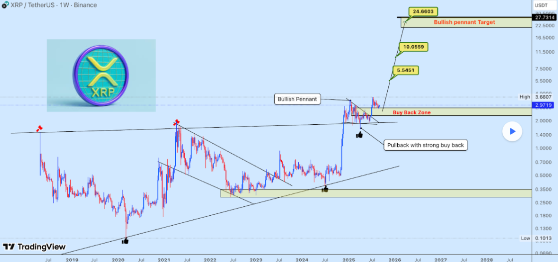 Laut Weslad ist XRP früher in diesem Jahr aus einem sogenannten bullishen Wimpel-Muster ausgebrochen. Dies ist eine Kursformation, die oft nach einem starken Anstieg entsteht und auf eine weitere Aufwärtsbewegung hindeuten kann.