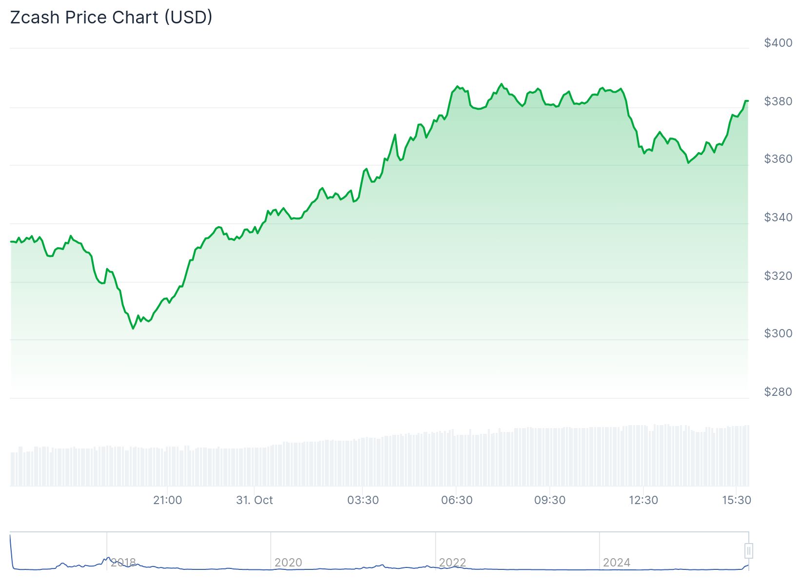 Mit dem jüngsten Anstieg setzt Zcash einen Aufwärtstrend fort, der bereits seit gut einem Monat anhält. Seit Ende September ist der ZEC-Kurs um satte 780 Prozent gestiegen: von rund 47 US-Dollar auf einen Höchststand von 367 US-Dollar.