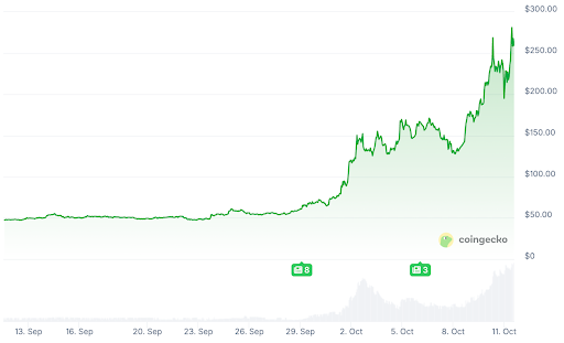 Blicken wir weiter zurück, zeigt sich: Zcash befindet sich schon länger in einem Aufwärtstrend. In den vergangenen sieben Tagen steht ein Plus von 97 Prozent zu Buche. Im zurückliegenden Monat sind es sogar beeindruckende 448,3 Prozent.