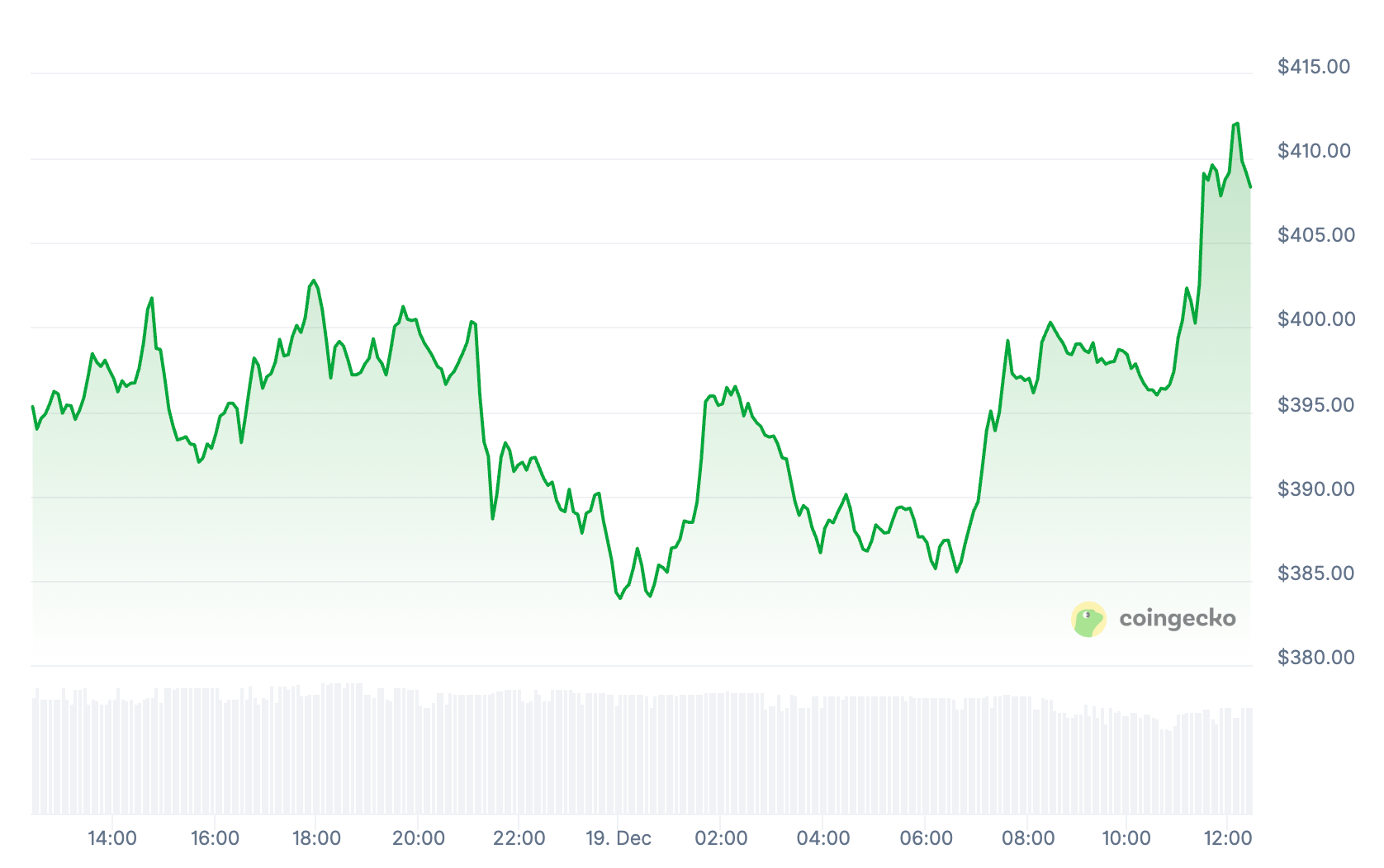 Zcash steht zum Zeitpunkt des Schreibens bei 409 Dollar und ist seit Jahresbeginn um fast 700 Prozent gestiegen. Im vergangenen Monat verlor die Währung jedoch etwa 32 Prozent an Wert, was Fragen zur Nachhaltigkeit der Rallye aufwirft.