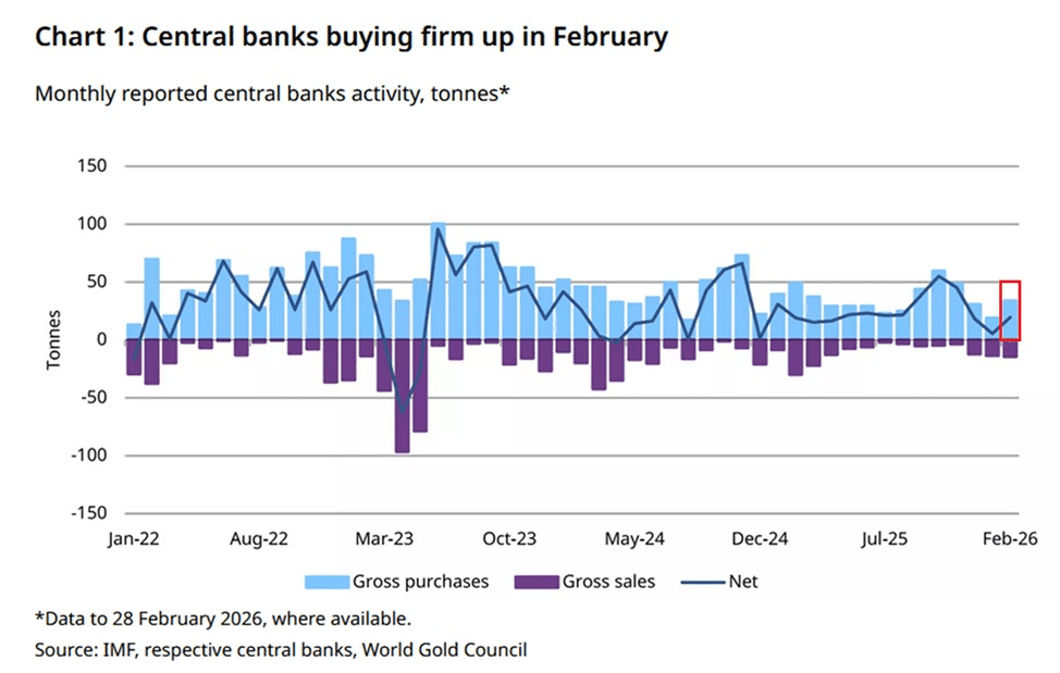 Der Hunger nach Gold bei den Zentralbanken ist weiterhin ungebrochen. Im Februar kauften Zentralbanken weltweit netto 19 Tonnen Gold, was den 23. Monat in Folge eines Nettozuwachses markiert.